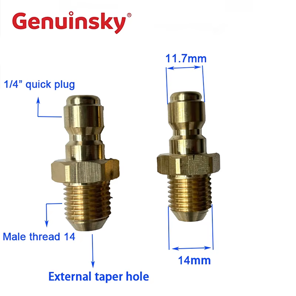Ez 1/4 hüvelykes sárgaréz gyorskioldó dugószerelvények. Maga a terméknek 1/4 "-es hím szálú külső kúpos lyuk van, és ez a vége a 14 mm -es hím, az átmérő 14 mm. A másik vége egy 1/4" gyors dugó, 11,7 mm átmérőjű.