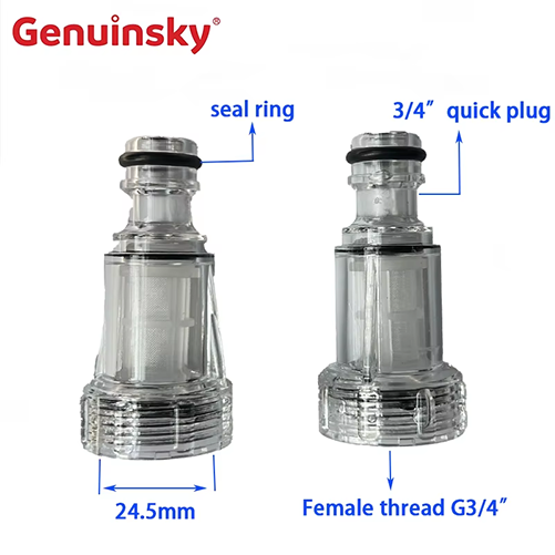 A Genuinsky bemeneti vízszűrője, a termék egyik vége 3/4 "gyors dugó van a tömítésgyűrűvel. A másik vége a G3/4" női szál, 24,5 mm átmérőjű.