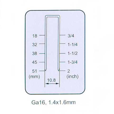 Az N851 légkorona tűzőgépek nagy teherbírású levegő körömfegyverek, nagy köröm GA16, 1,6mmx1,4 mm, válltávolság 10,8 mm, a körömmagasság 18 mm, 32 mm, 38 mm, 45 mm, 51 mm (3/4, 1-1/4, 1-1/2, 1-3/4, 2 hüvelyk) lehet.