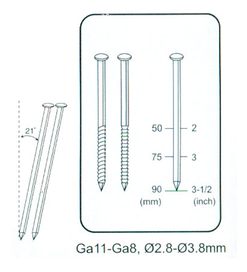 A köröm specifikációi GA11-GA8, átmérője 2,8-3,8 mm, és a hosszúság jellemzően 50 mm, 75 mm és 90 mm (2 hüvelyk, 3 hüvelyk, 3-1/2 hüvelyk). A köröm elrendezésének dőlési szöge 21 fok. A körömmélység a munka igényei szerint beállítható.