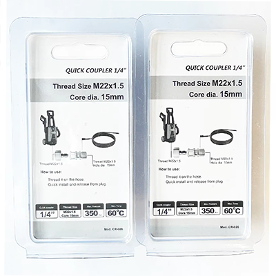 A két specifikáció 1/4 csatlakozója eltérő méretű. Az egyik M22 × 1,5, 22 mm átmérőjű, ebből a Core DIA.15 mm. A másik M14 × 1,5, átmérője 14 mm és kúpos lyuk. A termék két méretének kialakítása nagyon pontos, amelyet pontosan adaptálhat a megfelelő megfelelő tisztítógépekhez és felhasználható a nagynyomású mosópisztola -tömlőcsatlakozókhoz. Maga a termék anyaga sárgaréz. A sárgaréz anyag jó korrózióállósággal rendelkezik. A nagynyomású tisztító munkáknak gyakran nedves környezettel kell szembenézniük. Ezért maga a termék korrózióállósága normálisan működhet sok durva munkakörnyezetben. Ugyanakkor a sárgaréz jó rugalmassággal és keménységgel rendelkezik, és a nagynyomású vízáramlásban maga a termék tartóssága is fenntartható az ütközésben, és nem könnyű megtörni, ezáltal a vízszivárgást és a berendezések cseréjének költségeit. Ezen tisztítási folyamatok során a telepítés vagy a szétszerelés gyorsan elvégezhető. A felhasználók gyorsan befejezhetik a kapcsolati munkát eszközök nélkül, ami jelentősen javítja a munka hatékonyságát és időt takarít meg. Ugyanakkor a két specifikáció 1/4 csatlakozójának mérete szintén nagyon megfelelő. A felhasználók egy kézzel könnyen és rugalmasan befejezhetik a csatlakozási műveletet.
